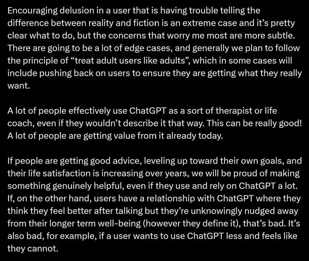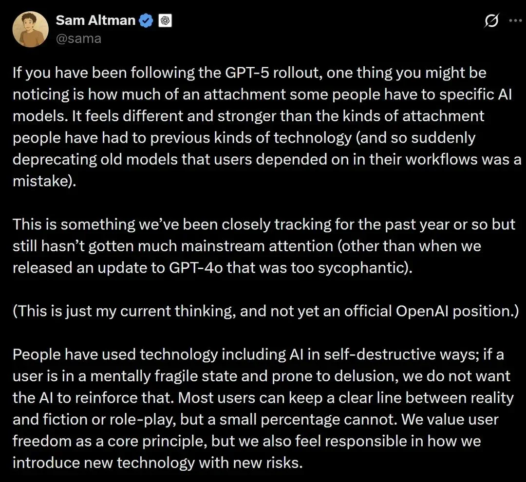 - Beyond reinstating older models to paying subscribers, OpenAI continues to bow to the pressure, tweeting on Friday that it would be “making GPT-5 warmer and friendlier based on feedback that it felt too formal before.”