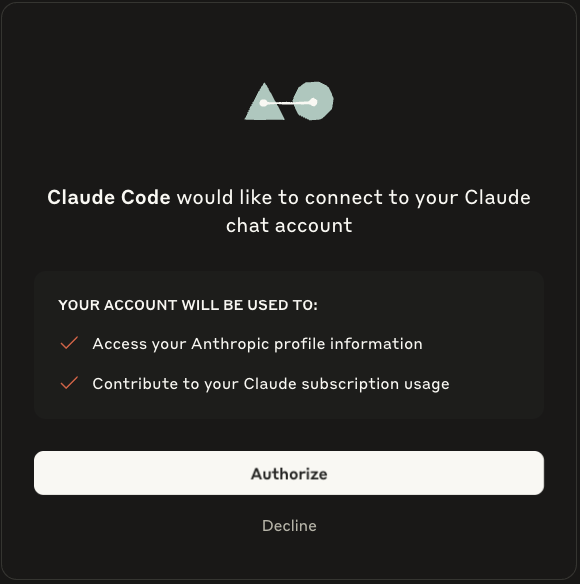 If you choose to log in with your subscription, you will be directed to Anthropics login page, and then asked to authorize ClaudeCode to your account: