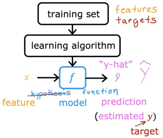 Then, you can feed a new input feature to the function, and the function will then produce a new output called y-hat (ŷ). If you refer to a models output as just y without the hat, then this refers to the target, which is the actual true value in the training set. in contrast ŷ is an estimate.